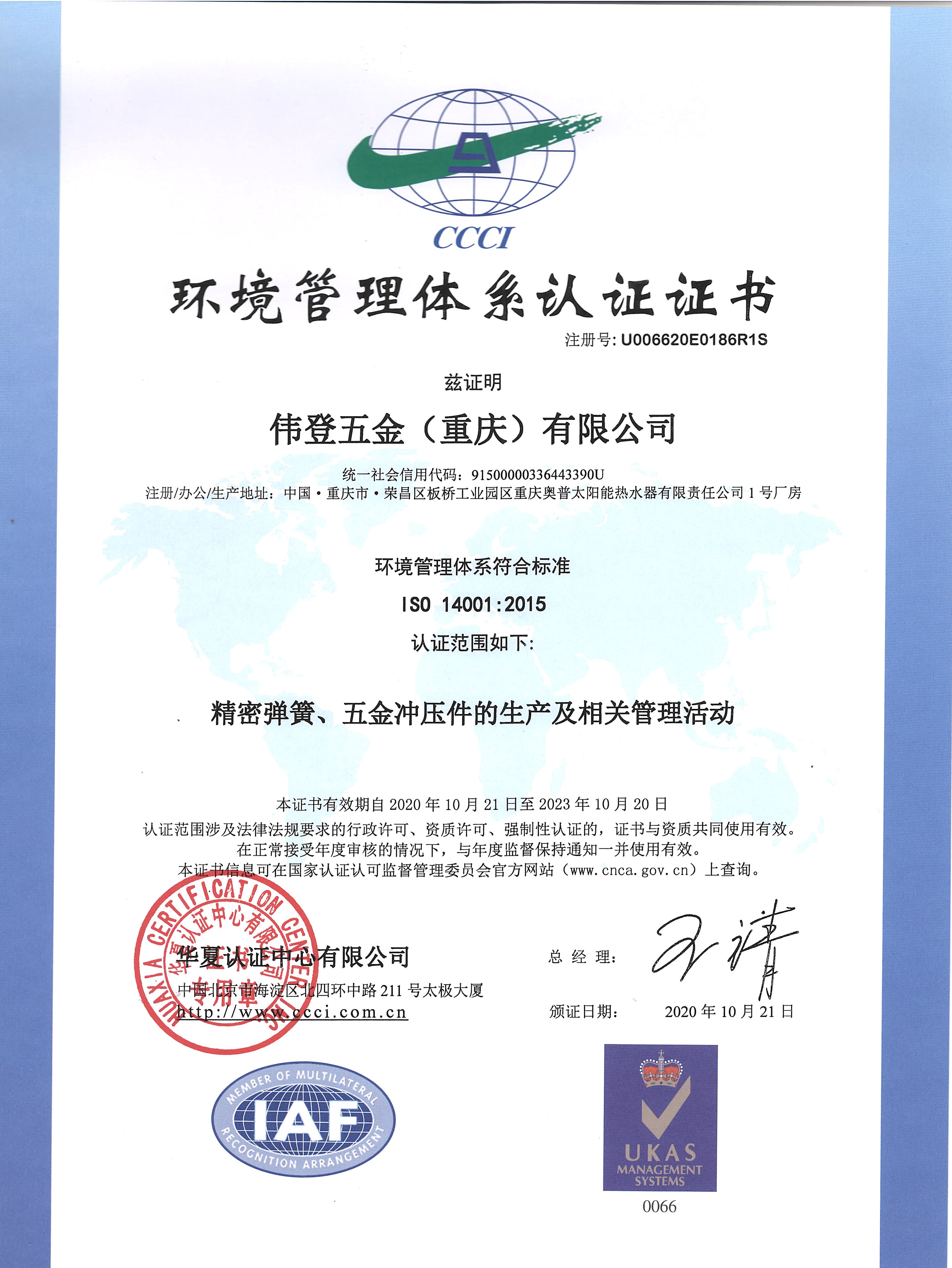 ISO 14001: 2015 英文版證書(偉登重慶)