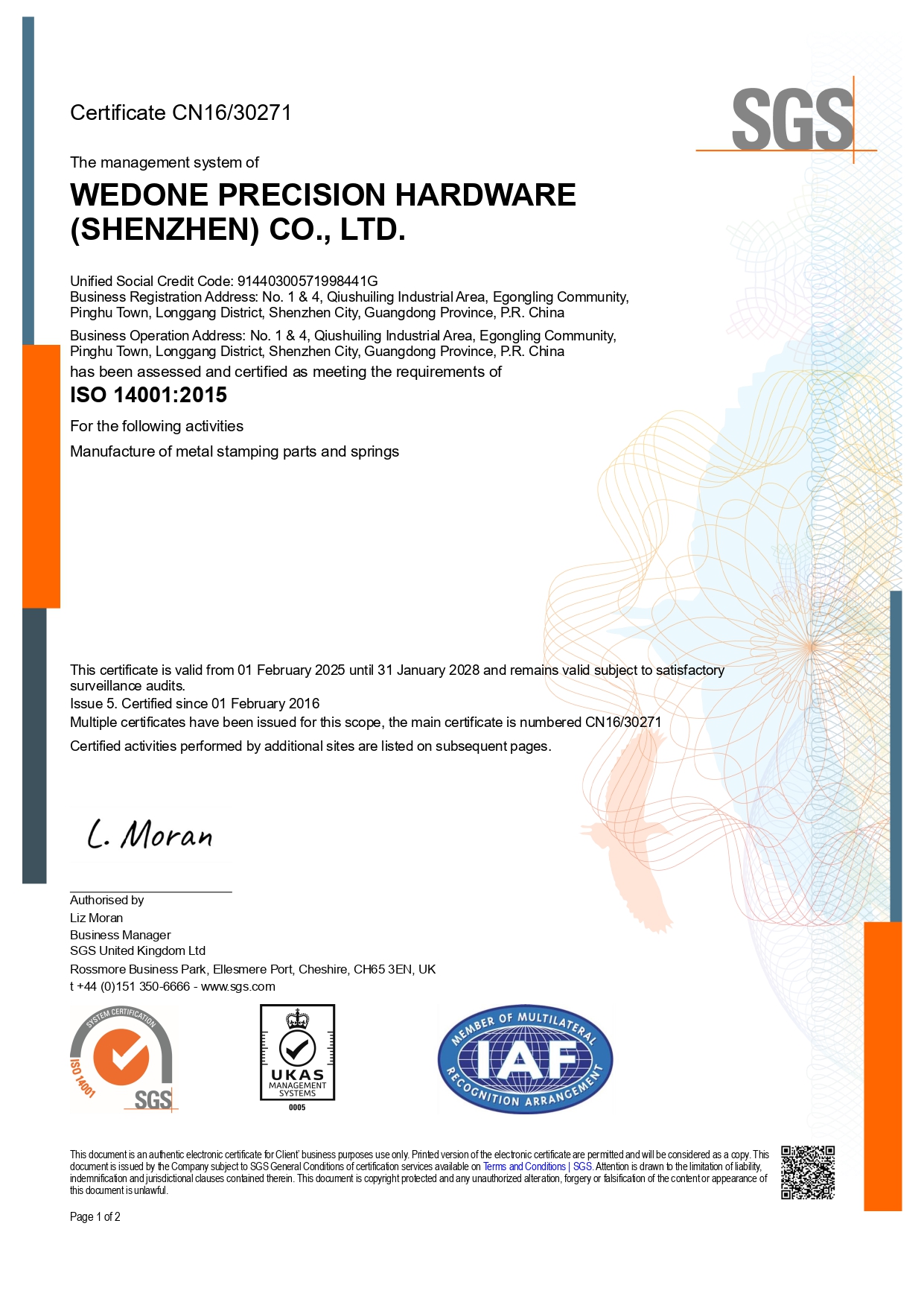 ISO 14001: 2015 英文版證書(偉登深圳)