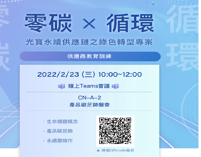 2022年2月16日、23日,客戶光寶科技組織了兩次供應商教育訓練的線上培訓,培訓的主題是:組織溫室氣體盤查、產(chǎn)品碳足跡盤查的基礎(chǔ)知識,永續(xù)云服務平臺針對組織溫室氣體盤查、產(chǎn)品碳足跡盤查的數(shù)據(jù)處理功能的介紹等。